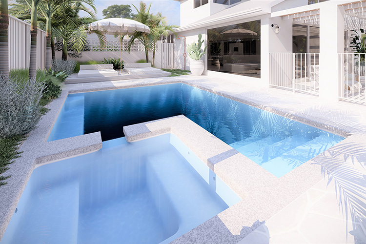 This one-piece pool and spa combination offers versatile functionality, allowing both the pool and spa to operate concurrently or independently. It features a generous bench seat, a spillway, and dual entry points, aligning with the latest trends in exterior concepts, making it the perfect choice for the entire family.